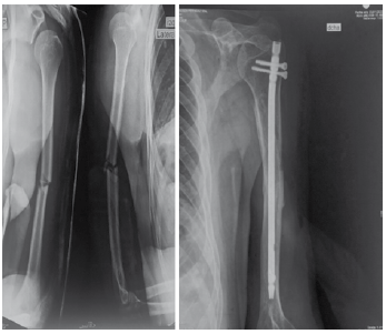 Figura N° 1. Radiografía con proyección anteroposterior y lateral donde se visualiza Fractura Humero diafisario izquierdo (imagen izquierda) Reducción indirecta mediante técnica de enclavado endomedular vía anterógrada. (imagen derecha)