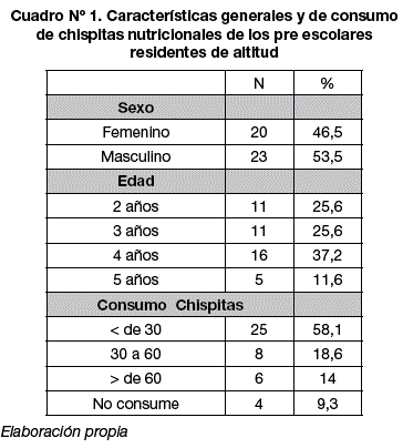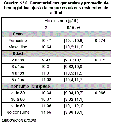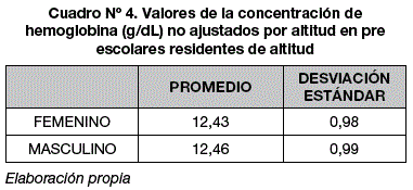 Coclusions: The hemoglobin levels increase according to age and not to the use of nutritional supplements "Chispitas". The average hemoglobin in both sexes is also evidenced, slightly similar between them, female 12.43 g/dL and male 12.46 g/dL; values below normal limits considered healthy in order to define anemia at high altitude.