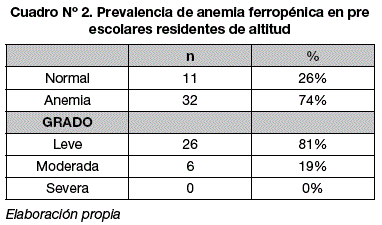Method: It was used the photometric system B Hemoglobin HemoCue to process and to determine the hemoglobin levels of the capillary blood samples. At a height of 3073 meters above sea level, The cut-off point of hemoglobin with a cross-correlation figure of 1.9 is the following: from 11.5 to 9.5mg/dL mild anemia, from 9.5 to 7,5 mg/dL moderate anemia and less of 7,5mg/dL severe anemia.