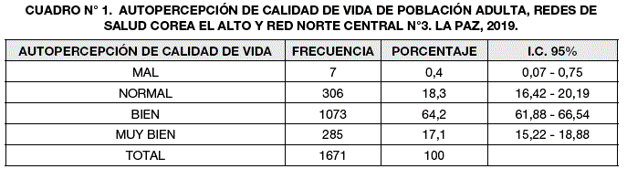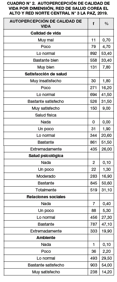 Material and methods: Cross-sectional design, carried out in one network in El Alto and another in La Paz, with 1671 study units. The WHOQOL-BREF (26 items) was used, with Likert-type response options and structured in 4 dimensions: Physical Health, Psychological Health. Social relationships and Environment.