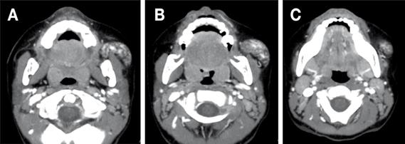 Figura Nº3 . Vista axial de TAC que muestra masa heterogénea en las regiones geniana y maseterina izquierdas, anterior y lateral al músculo buccinador (A), lateral al músculo masetero (B) y que llega hacia abajo hasta el nivel del arco dentario mandibular (C).