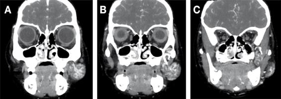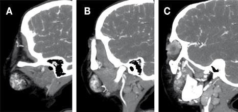 Figura Nº5 . Vista sagital de TAC que muestra masa heterogénea localizada por debajo de la órbita (A), anterior al músculo masetero (B) y con importante vascularización por la arteria maxilar interna (C).