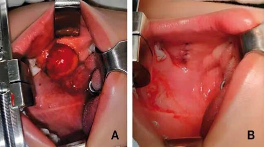 Posterior a la valoración de los datos clínicos e imagenológicos se decide su tratamiento mediante escisión quirúrgica bajo anestesia general, abordando la lesión mediante una incisión horizontal de 2.5 cm de longitud a nivel de la mucosa yugal izquierda, casi paralela a la línea de oclusión dentomaxilar y a 1 centímetro por debajo del orificio de desembocadura del conducto de Stenon. Seguidamente, se identificó al músculo buccinador para su posterior disección en el mismo sentido de la incisión mucosa, llegando a exponer la masa tumoral para su correspondiente exéresis, previa identificación del pedículo vascular procedente de la zona posterior (región pterigomaxilar), mismo que se liga. Luego del control de la hemostasia se concluye el procedimiento con puntos simples de sutura del plano muscular y mucoso (figura 6).
