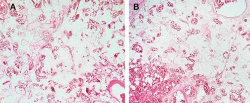 Figura Nº7 . (H y E, 10 y 40x) Fotomicrografía panorámica (A) y acercamiento (B) observándose tejido adiposo maduro vascularizado.