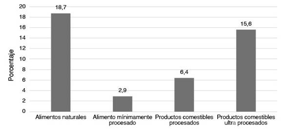 En el gráfico N° 1 sobre el grupo de alimentos que trae de casa para el consumo los estudiantes a las unidades educativas fiscales y de convenio del municipio de La Paz, el 18.7% de los escolares lleva diariamente alimentos naturales especialmente frutas de casa para el consumo en la unidad educativa, aproximadamente el 2.9% de los escolares trae diariamente alimentos mínimamente procesados especialmente yogurt, el 6.4% lleva diariamente productos comestibles procesados, y aproximadamente el 15.6% de los estudiantes lleva diariamente productos comestibles ultra procesados de su casa especialmente bebidas azucaradas para el consumo en la unidad educativa.