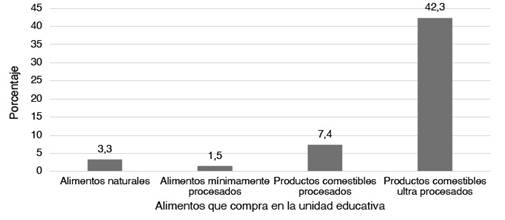 En el grafico N° 2 sobre el grupo de alimentos que compran los estudiantes en las unidades educativas fiscales y de convenio del Municipio de La Paz, el 3.3% de los escolares compra diariamente alimentos naturales en la unidad educativaespecialmentefrutas,aproximadamente el 1.5% de los escolares compra diariamente alimentos mínimamente procesados en la unidad educativa especialmente yogurt, el 7.4% compra diariamente productos comestibles procesados y el 42.3% de los escolares compra diariamente productos comestibles ultra procesados en la unidad educativa especialmente bebidas azucaradas.