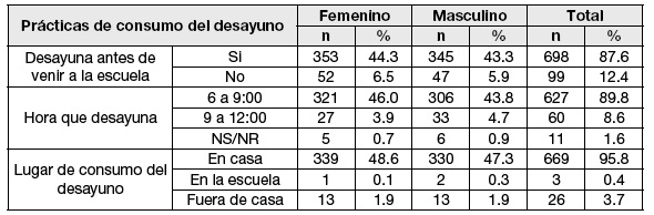 En el cuadro N°1 se describe las prácticas de consumo del desayuno de los estudiantes, donde el 87.6% desayunó antes de ir a la unidad educativa, sin embargo, el 12.4% no desayuno, especialmente las niñas 6.5%. El horario de desayuno más frecuente es entre 6:00 a 9:00 de la mañana, siendo el 46% las niñas que desayunan más en ese horario. El 95.8% de los escolares desayuna en casa, especialmente las niñas con el 48.6%.