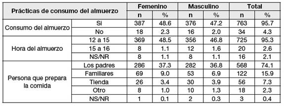 En el cuadro N°2 de prácticas de consumo del almuerzo en estudiantes de las unidades educativas fiscales y de convenio del Municipio de La Paz, aproximadamente el 95% de los escolares almuerza y el horario de almuerzo más frecuente es de 12:00 a 15:00. El 74.1% de los padres prepara la comida de los escolares, el 15.9% lo prepara algún familiar y el 7.3% compra el almuerzo.