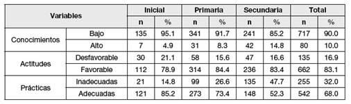 La proporción de mujeres de nivel inicial, primaria y secundaria demostraron mayores conocimientos 5.9% y prácticas 34.8% sobre alimentación saludable en comparación a los varones, sin embargo, tanto varones y mujeres presentaron actitudes favorables, los datos reportados por Rivas S., son mayores en el estudio realizado en Perú donde las mujeres demostraron conocimientos altos, practicas adecuadas y actitudes favorables 76,5% vs. 75,0%, 75,5% vs. 70,7% y 72,5% vs. 67,9%, respectivamente11. Es fundamental abordar estas brechas para promover una cultura alimentaria saludable en toda la población, diseñando intervenciones específicas que aborden las necesidades particulares de cada género y nivel educativo.