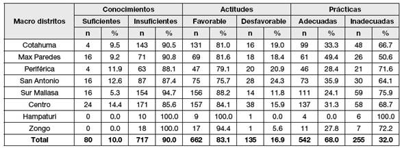 En el cuadro N° 5 describe los conocimientos, actitudes y prácticas sobre alimentación saludable en escolares de las unidades educativas fiscales y de convenio del Municipio de La Paz por macro distrito. El 100% de los estudiantes encuestados de Hampaturi y Zongo tienen conocimientos insuficientes sobre alimentación saludable. El 88.2% de los estudiantes del macrodistrito Sur Mallasa presentaron una actitud favorable frente a la alimentación saludable. El 71.6% de los estudiantes del macrodistrito Periférica presentaron prácticas inadecuadas sobre alimentación saludable.