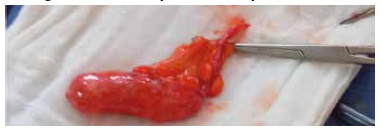 La decisión clínica fue realizar una histerectomía total abdominal, salpingectomía bilateral profiláctica y adhesiolisis. Durante la cirugía, se encontró un apéndice cecal inusualmente largo, de 9.5 cm con abundante contenido mucinoso que adelgazaba notoriamente la pared. Por lo que el servicio de Ginecología tomó la decisión de realizar el llamado a Cirugía General para valoración y conducta respectiva a seguir, después de la misma, se decide y bajo autorización del personal presente la realización de una apendicectomía típica, procedimiento sin complicaciones, la pieza operatoria se evidencia en la Figura Nº 1.