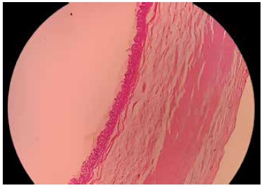 Mismas que llevada a anatomía patológica para su estudio (Figura Nº 2), se evidencia pared de apéndice cecal que a nivel de dos tercios distales muestra luz tapizada por capa plana de células cúbicas de núcleos elongados, citoplasma amplio con abundantes vesículas secretoras mucinosas, pared fibrosa que reemplaza músculo liso con focos de mucina acelular entre las fibras, serosa con vasos sanguíneos congestivos. Imagen consistente con neoplasia mucinosa apendicular de bajo grado que corresponde a un cistoadenoma mucinoso de apéndice cecal.