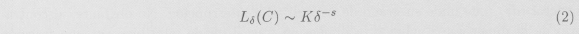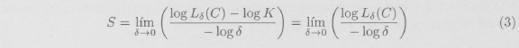 con K y s constantes. Por lo tanto, tomando logaritmos, log Lδ(C) ≈ log δ para δ pequeños. O en términos más precisos