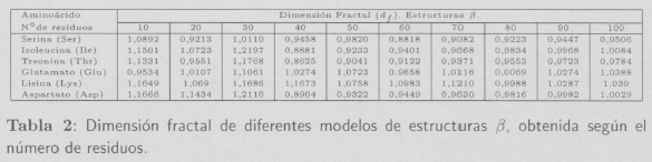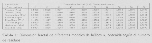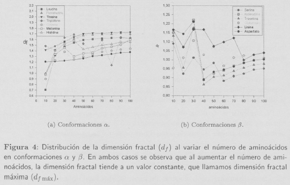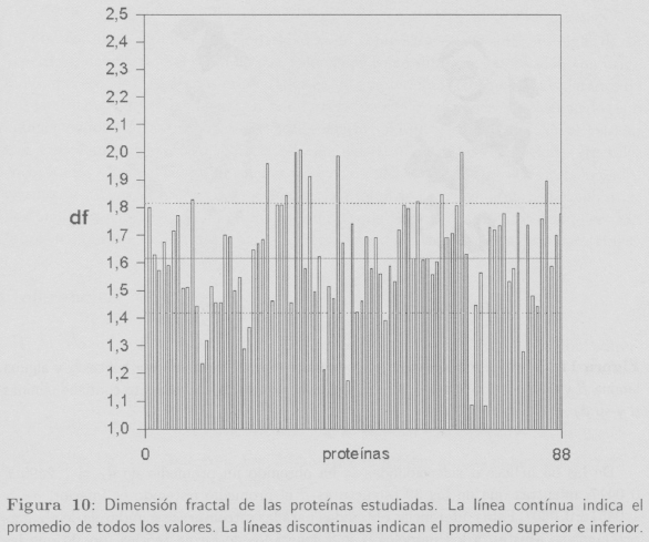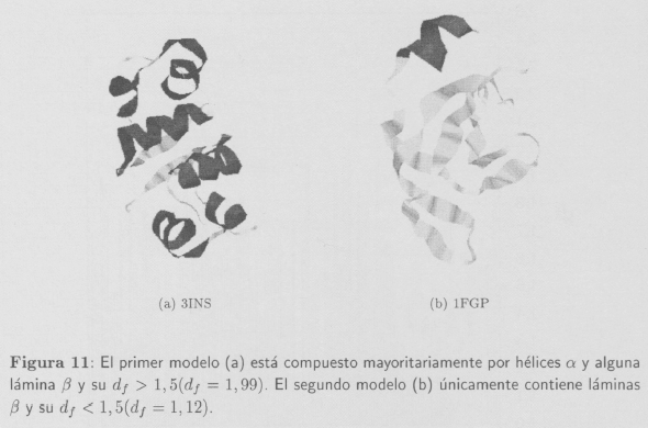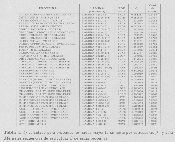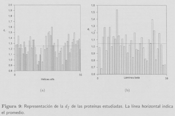 Isogai e Itoh [5] también demuestran que es posible asignar dimensiones fractales características a las proteínas que mayoritariamente están formadas por hélices α o estructuras β. En sus estudios concluyen que las proteínas con conformaciones α poseen una dimensión fractal df = 1,38, mientras que las proteínas con conformaciones mayoritariamente (5 presentan una dimensión fractal ligeramente menor (df = 1,29). En nuestro caso los valores promedio encontrados son: df = 1,2490 ± 0,0417 para hélices α y df = 1,0451 ± 0,0601 para estructuras β.