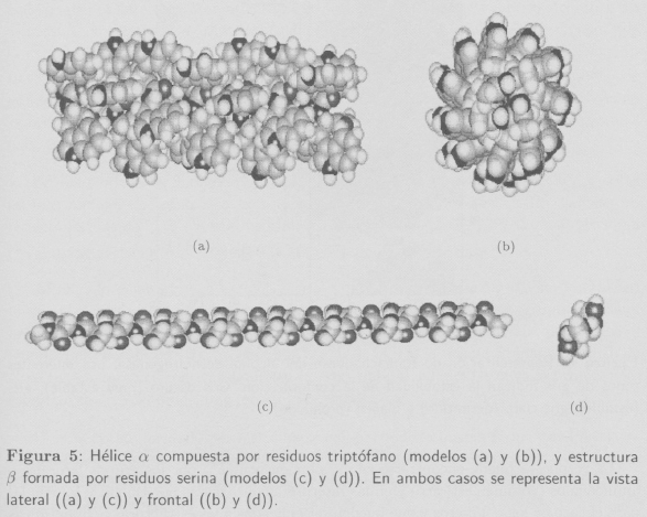 En la Figura 5 se representa un modelo de hélice a formada por residuos de triptófano (Trp) y un modelo de una estructura β compuesta por residuos de serina generados por ordenador.