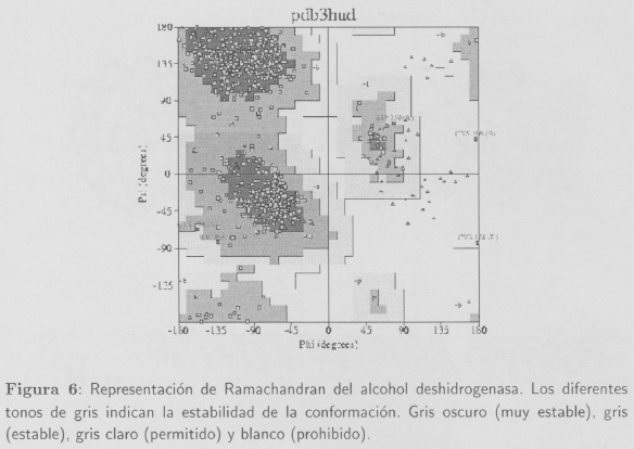 Las conformaciones de las cadenas polipeptídicas son estudiadas mediante la descripción de cada uno de los residuos de aminoácidos en el gráfico bidimensional de Ramachandran. En el gráfico de la Figura 6 se sitúan los residuos entre los ángulos -180° < Φ < +180° y -180° <Ψ< +180° y se muestran las conformaciones más normales observadas en las cadenas polipeptídicas.
