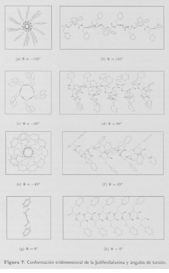 En los modelos estudiados se observa que aquellos que han sido generados con aminoácidos de bajo volumen (volumen estérico), como es el caso de la alanina y la glicocola, se obtienen dfmáx para los ángulos Φ = Ψ = 45° y Φ = Ψ = +45°. En cambio, para los modelos generados con aminoácidos con mayor volumen estérico, como el triptófano, cisteína, metionina, histidina y fenilalanina, se obtiene un dfmáx para los ángulos Φ = Ψ = -90° y Φ = Ψ = +90°.