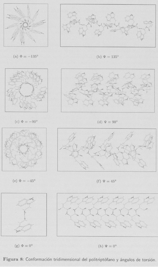 La fenilalanina y el triptófano (VVan der Waals = 135Å3 y 163Å3, respectivamente) poseen grupos laterales aromáticos. El triptófano tiene mayor volumen debido a su estructura bicíclica por lo que la df máx del modelo generado con triptófano es mayor que la del modelo generado con fenilalanina. (df máx (Trp) = 1,61 y df máx (Phe) = 1,56). Las Figuras 7 y 8 representan las conformaciones tridimensionales de los dos modelos de polipéptidos generados con éstos aminoácidos. En ambos casos, la mayor compactación se produce a Φ = Ψ = 45° y Φ = Ψ = +45°, pero la mayor estabilidad se produce para Φ = Ψ = -90° y Φ = Ψ = +90°.