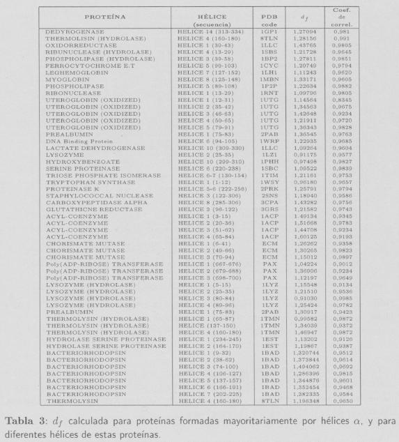 La tercera parte del estudio se ha centrado en la selección de proteínas del PDB (Protein Data Bank [8]) que contengan mayoritariamente un sólo tipo de estructura secundaria (hélice α o estructura β), y se ha calculado la df para cada una de esa proteínas, así como únicamente para cada una de las secuencias de aminoácidos correspondientes a la conformación mayoritaria dentro de la proteína, descartando el resto de estructuras. Algunos de los resultados obtenidos para las más de 100 proteínas estudiadas se indican en las Tablas 3 y 4. Los resultados obtenidos para el caso de la hélice α se muestran en la Tabla 3.