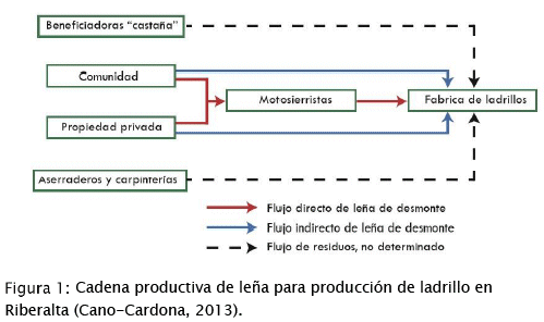 c) Ladrilleras artesanales, de acuerdo a estudio de Diagnóstico de las Cadenas Productivas de la Madera y Castaña en el Mercado Doméstico de Riberalta-Beni, se tiene registro del uso de cáscara de castaña en cantidades indeterminadas, descrito así por su bajo consumo, pero se establece la leña de desmonte como fuente principal de combustible (Cano-Cardona, 2013). Ver Figura 1: