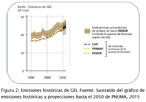 Las emisiones de gases de efecto invernadero de la combustión de la biomasa no se incluyen en los inventarios totales nacionales, pero se las registra como elemento informativo (cuando es posible) a los fines de la verificación cruzada y para evitar el cómputo doble (IPCC, 2006). El PNUMA presenta una relación de emisiones históricas de GEI con y sin consideración de la quema de biomasa a gran escala (PNUMA, 2015).