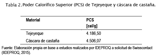 Para determinar la energía que puede ser aprovechada de una determinada biomasa, se debe considerar su poder calorífico. Como parámetro comparativo, se considera la cascara de castaña y la leña con mayor uso en el sector ladrillero, el Tejeyeque con resultados plasmados en la Tabla 2.
