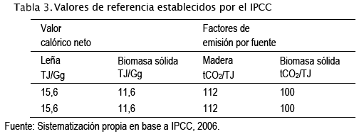 El IPCC, como instancia de referencia respecto a investigaciones y estadísticas relacionadas con el Cambio Climático, ha desarrollado Directrices para los inventarios nacionales de gases de efecto invernadero, esto con la finalidad de poder cuantificar las emisiones y que estas puedan ser comparables entre regiones o países. Ente los valores promedio de referencia que presenta el IPCC para realizar los cálculos correspondientes, se encuentran los valores calóricos netos y factores de emisión por fuente (IPCC, 2006). En la Tabla 3 se presentan dichos valores para el caso de estudio.