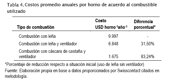 De acuerdo a datos tabulados, la tonelada de cascara de castaña tiene un costo de 6,98 dólares americanos y la tonelada de leña 41,57 dólares americanos. Considerando los resultados de cálculos de combustible utilizado tanto de castaña como de leña, 145,86 y 15,81 toneladas, respectivamente, se tiene un total de 1.675,32 dólares americanos anuales.