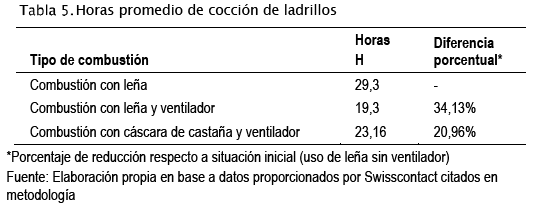 Se considera las horas de trabajo necesarios para la cocción de ladrillos, se ha calculado la diferencia de tiempos de acuerdo a los reportes de prueba de tecnología (descritos en metodología de cálculo de costos), información que permite hacer una comparación entre el antes y después del uso de ventilador. No se tienen datos de variaciones de tiempo de cocción usando leña y cáscara de castaña, en este sentido, se realizó entrevista vía teléfono a la productora Vilma Villarroel Rivera en fecha 10 de septiembre del 2017. Entre las preguntas realizadas se consultó sobre la diferencia de tiempo de quema entre el proceso de cocción con leña y cáscara de castaña.
