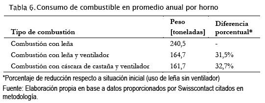 Para el cálculo de consumo de cascara de castaña, los resultados tabulados sobre 10 hornos, muestra un consumo de 145,86 t de castaña y 15,81 t de leña al año, haciendo un total de 161,67 toneladas de combustible.