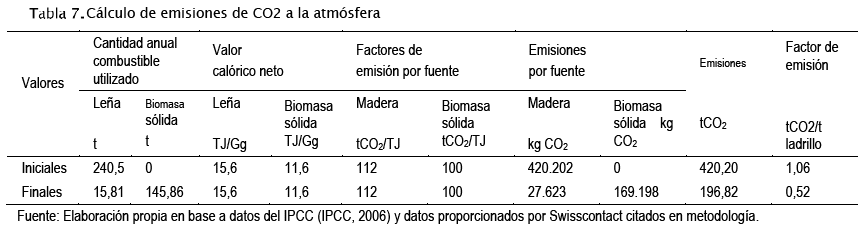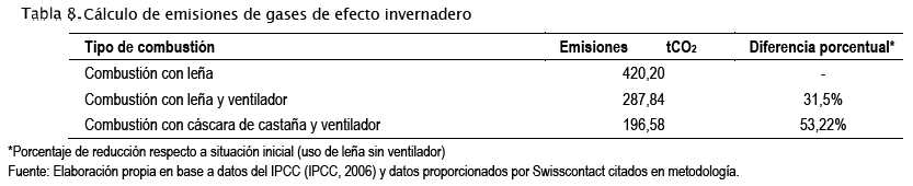 En base al combustible promedio anual utilizado por horno y considerando el factor de emisiones de CO2 establecidos como valores de referencia por el IPCC, se ha calculado los valores referenciales presentados en la Tabla 7 (IPCC, 2006) para emisiones iniciales con uso de leña sin ventilador y finales con uso de cascara de castaña y ventilador.