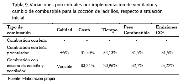 En revisión bibliográfica se tiene establecido un incremento del 5% en la calidad del producto por uso de ventilador usando leña como combustible. Respecto al cambio de combustible, en entrevista realizada a productora de ladrillos, menciona que la calidad del ladrillo está relacionada con la humedad de la cáscara de castaña. A mayor humedad menor rendimiento. El rendimiento es similar a la quema con leña cuando la cáscara de castaña no presenta altos niveles de humedad (Villarroel Rivera, 2017).