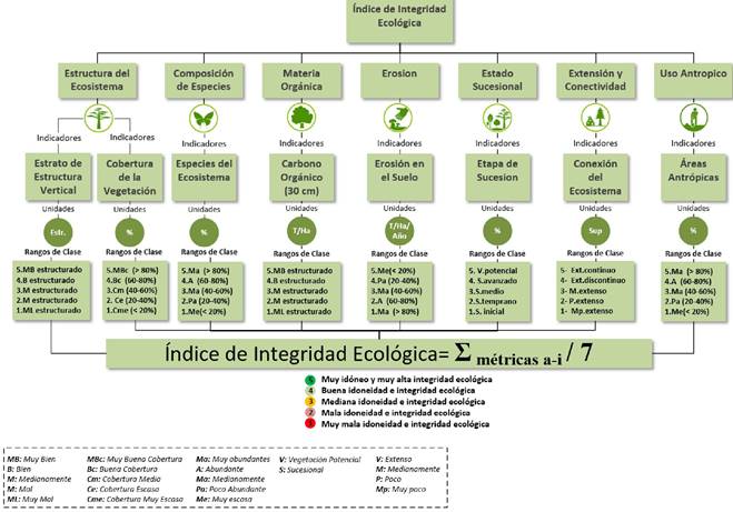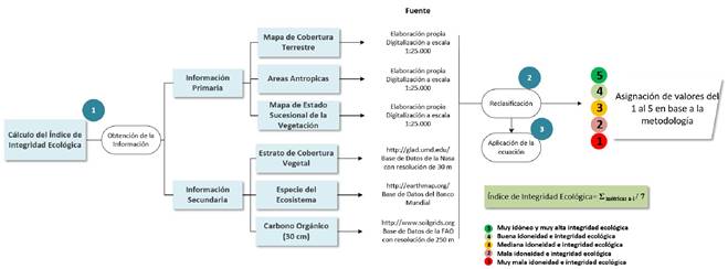 El cálculo del Índice de Integridad Ecológica, parte de realizar una superposición o suma de todos los parámetros descritos anteriormente, ya que cada parámetro fue clasificado en un rango de 1 a 5 utilizando sistemas de información geográfica como se explicó con anterioridad. En ese sentido, se realizó una suma total de los parámetros (de las capas de información reclasificadas) y se dividió el valor resultante por el número de parámetros estudiados, para así obtener los valores del Índice de integridad ecológica de la superficie de las cuencas de estudio, estos valores se encuentran en un intervalo de 1 (mala integridad ecológica) a 5 (muy buena integridad ecológica).