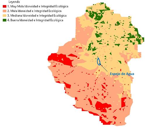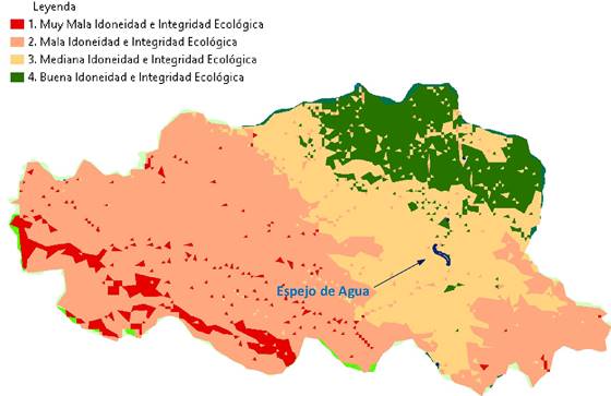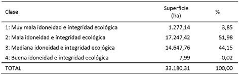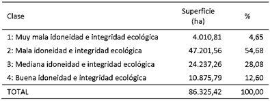 Con relación a la extensión superficial, la cual está presente en la Tabla 1, la clase con predominancia resulta la de mala integridad ecología con una superficie de más de 47 mil hectáreas, mientras que con 24 mil hectáreas sigue la clase de mediana idoneidad ecológica.