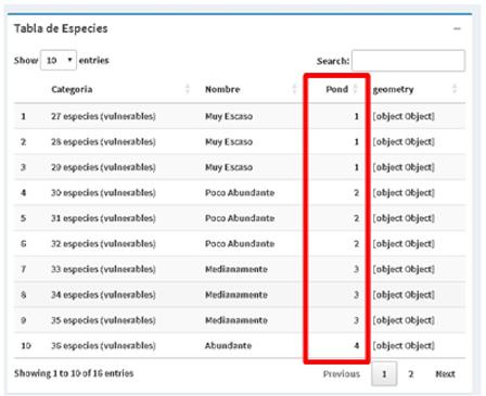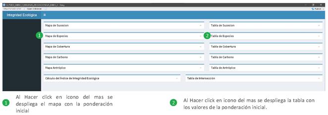 En el lado derecho se observa una tabla para cada parámetro donde se despliega los valores de ponderación inicial de los parámetros evaluados (Figura 12). El usuario puede interactuar con estos valores y una vez que está conforme con la ponderación asignada, el sistema automáticamente recalcula todos los parámetros y hace una sumatoria y división para el cálculo del índice y genera un mapa actual de Integridad Ecológica.