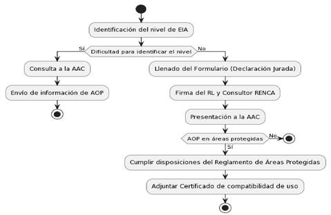 La Ficha Ambiental incluía la identificación de impactos clave y la identificación de la posible solución para los impactos negativos a través de un diagnóstico inicial o línea base y el desarrollo de una matriz de evaluación de impacto, cuya presentación era revisada por la autoridad ambiental departamental competente para definir la categoría de Estudio de Evaluación de Impacto Ambiental. Actualmente esta categorización se realiza de manera directa revisando el listado de AOPs del ANEXO A adjunto en el Decreto Supremo N° 3549 y el subsecuente llenado del Formulario de Nivel de Categorización Ambiental, que sistematiza la información de una actividad, obra o proyecto (AOP) en una etapa de prefactibilidad, identificando los impactos clave y la mitigación o adaptación para el impacto (Figura 2).