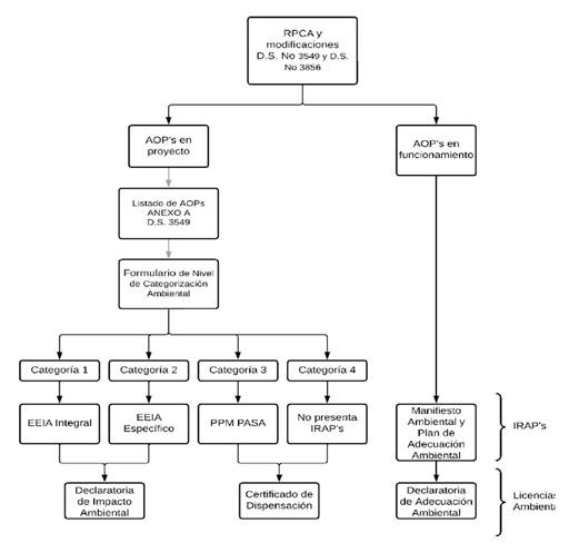 Los IRAP's del tercer nivel (categoría 3) incluyen acciones para evitar o mitigar efectos adversos (Plan de Prevención y Mitigación y Plan de Adecuación y Seguimiento Ambiental), otorgándole un Certificado de Dispensación como licencia ambiental. El contenido específico de cada uno de los documentos se detalla en los Anexos del D.S. N° 3549 del año 2018. Por último, el cuarto nivel (categoría 4) no requiere ningún procedimiento adicional. Las licencias ambientales, así como los IRAP's fijan las condiciones ambientales que deben cumplirse en todo el transcurso de la AOP y tiene una validez de diez años.