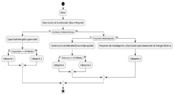 La gestión ambiental de proyectos hidroeléctricos en Bolivia se rige bajo la normativa boliviana mencionada, la cual establece procedimientos técnicos y administrativos para el inicio, ejecución y conclusión del proyecto. El proceso de evaluación de impacto ambiental en proyectos hidroeléctricos es importante para garantizar la sostenibilidad ambiental y social. Los ámbitos a través de los cuales se desarrolla son el administrativo, normativo- legal y técnico; que se adhiere a los estándares internacionales de los organismos financiadores. En la normativa, son categorizados en el sector Energía, subsector Energía Eléctrica en el D.S. N° 3856 del 2018 y se adhieren a los procesos generales de gestión ambiental ya mencionados. Las categorías en los proyectos hidroeléctricos van desde la 1 a la 3, dependiendo de la potencia de instalación (Figura 3).
