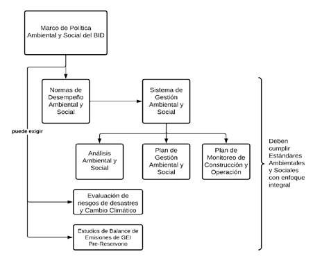 En su nuevo Marco de Política Ambiental y Social (MPAS) del 2021, el BID ha definido sus Normas de Desempeño Ambiental (NDAS) que buscan no solo prevenir riesgos e impactos ambientales y sociales, sino también agregar valor e impulsar el desarrollo con mejores prácticas en la gestión ambiental y social. El MPAS representa un enfoque actualizado y orientado a resultados en la gestión ambiental y social en proyectos del BID. El prestatario (en este caso el Estado cuando solicita créditos de envergadura para la construcción y/o puesta en marcha de proyectos onerosos como lo son los hidroeléctricos y/o multisectoriales del sector) se compromete con el BID a la evaluación, gestión y seguimiento de riesgos e impactos ambientales, que logren resultados acordes a los Estándares Ambientales y Sociales (EAS). Para el cumplimiento de los EAS se realiza un Sistema de Gestión Ambiental y Social (SGAS) que consta de tres documentos: Análisis Ambiental y Social (AAS), Plan de Gestión Ambiental y Social (PGAS) y Plan de Monitoreo de Construcción y Operación (Figura 4).