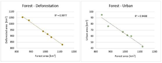 The land use change dynamics show an inverse and proportional relationship between forest cover and urban/deforested areas, where the variability of the dependent variable is explained by the regression model (Figure 1). The reduction in forest areas coincides with the increase in deforested and urban areas, a trend linked to the expansion of human activities in the municipality.
