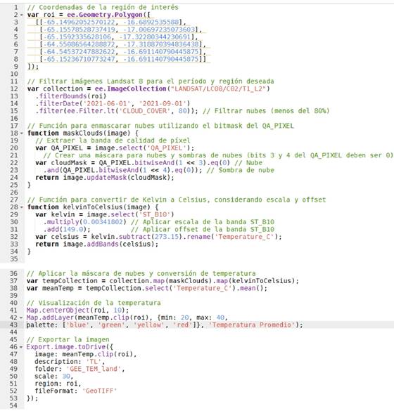 The analysis of land surface temperature (LST) was derived from data of the satellite product LANDSAT/LC08/C02/T1_L2, corresponding to the Thermal Infrared Sensor (TIRS) onboard Landsat 8. This product provides calibrated thermal data and tools to filter atmospheric effects and clouds. It also provides images with a spatial resolution of 100 m for the thermal bands, which were rescaled to 30 m for integrated analysis. In this study, Band 10 TIRS 1 (10,6 - 11,19 μm; 100 m) was specifically used for estimating surface temperature.