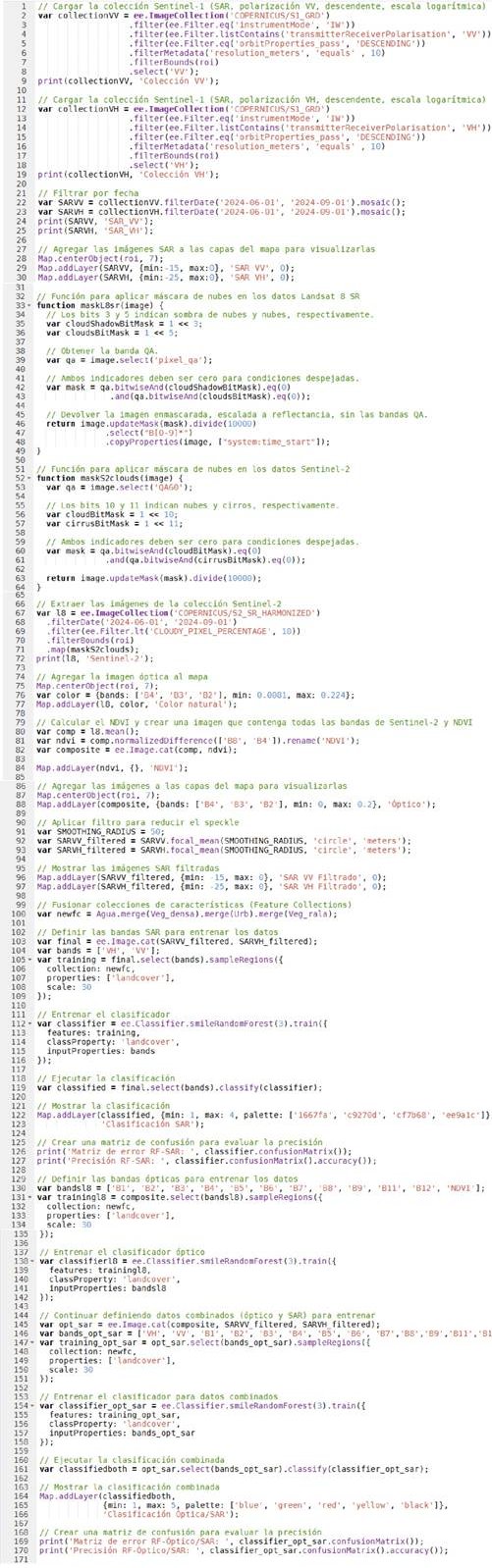 SAR (Synthetic Aperture Radar) images from the Sentinel- 1 satellite were processed, corresponding to the Interferometric Wide Swath (IW) acquisition mode in VV and VH polarizations and in descending orbit. Speckle noise was reduced using a focal mean filter (50 m radius), ensuring a spatial resolution of 10 m. This preprocessing step is crucial to improve the quality of SAR images in classification applications (Yarrakula et al., 2023).