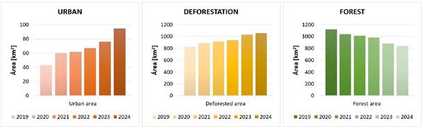 The supervised classification using Random Forest revealed a progressive loss of forest at a rate of 6% annually, while urban areas grew by 18% per year, and deforested areas increased by 5%. Among the land cover changes, a decrease in forest cover during the period from 2019 to 2024 can be seen, from approximately 1200 km2 in 2019 to values lower than 1000 km2 in 2024, reflecting a continuous deforestation process. In contrast, there is a steady increase in deforested areas, with an increase of approximately 200 km2 in the last five years. Similarly, urban areas also show significant growth, rising from less than 60 km2 in 2019 to more than 100 km2 in 2024. Figure 2 shows the progressive loss of forest cover, with a reduction from 1200 km2 in 2019 to less than 1000 km2 in 2024, accompanied by an increase in deforested and urban areas.