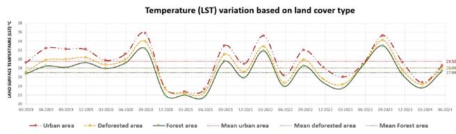 The time-series analysis of satellite images from the Landsat 8 Thermal Infrared Sensor (TIRS) allowed for the assessment of LST behavior on a quarterly basis, clearly showing seasonal variations across the three land cover types. Urban areas exhibit an average temperature of 29,5°C, whereas deforested zones maintain an average of 28°C, and forested areas record the lowest surface temperatures, approximately 27°C.