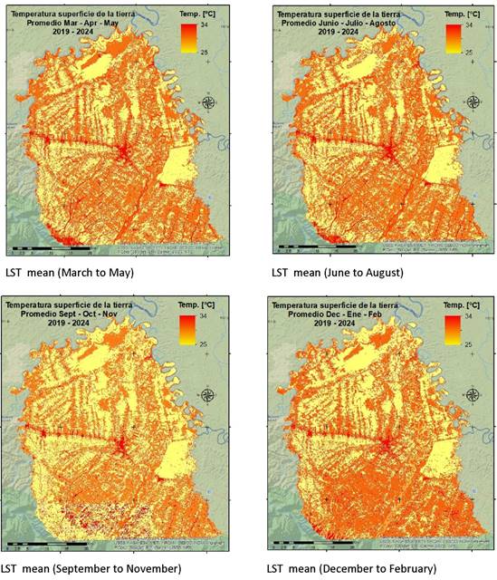 The evaluation of the average Land Surface Temperature (LST) was determined for each quarter of the year, using zonal statistics. This analysis was conducted for each pixel within the areas classified according to land cover types, obtaining the corresponding LST value. These values were then averaged within each category, yielding a representative quarterly value of the average temperature for each land cover type. This approach allowed for the analysis of temperature variation based on the specific characteristics of each land cover type and its behavior over time.