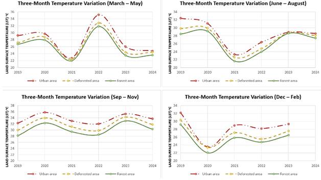 Urban areas consistently showed the highest temperatures compared to deforested and forested areas in all quarters, and deforested areas exhibited intermediate temperatures, while forested areas maintained the lowest and most stable temperatures, highlighting their role as thermal regulators throughout the year.