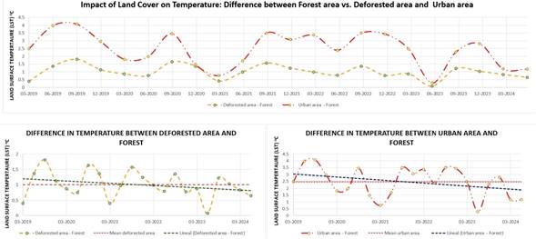 The temperature difference between urban and forested areas shows a slight decreasing trend, although values remain high over time, highlighting the persistence of the urban heat island effect. On the other hand, the temperature difference between deforested and forested areas also presents a slight downward trend, with average values around 1,2°C, which could indicate thermal stabilization processes associated with land-use changes or partial vegetation recovery.