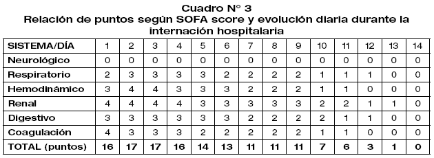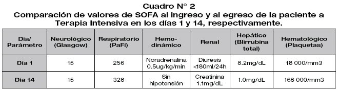 A continuación, se realiza laparotomía, procedimiento en el que se evidencia hemoperitoneo masivo a partir de la arteria epigástrica; se liga la misma y se dejan 2 drenajes tubulares en cavidad abdominal. La paciente, posterior a este evento continua su tratamiento en la Unidad de Cuidados Intensivos con puntaje de APACHE II a las 24 horas de 26 puntos, con probabilidad de mortalidad predicha de 38%, y un score SOFA 16 puntos. La evolución es favorable de forma progresiva, lográndose con éxito la desconexión de la ventilación mecánica, así como la interrupción del soporte vasopresor, alcanzándose adecuados volúmenes urinarios y disminución progresiva de los azoados, siendo dada de alta tras 11 días de tratamiento intensivo, para luego ser trasladada a una sala de obstetricia en regular estado general; posteriormente a los 3 días es dada de alta hospitalaria. En el Cuadro 2 puede observarse la comparación de los valores de SOFA al ingreso y al momento de alta de Terapia Intensiva, así como la evolución diaria según el score SOFA en el Cuadro 3.