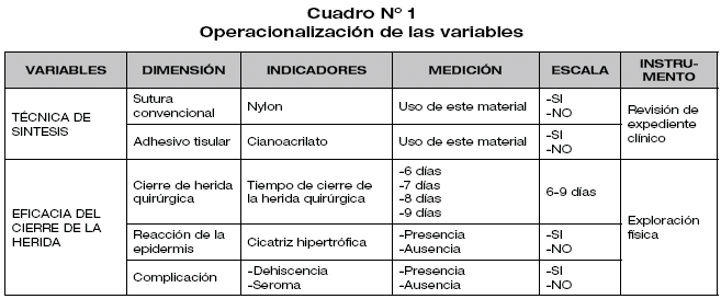 Variables: Variable independiente (Causa): Técnica de síntesis de piel; variable dependiente (Efecto): Eficacia del cierre de la herida quirúrgica.