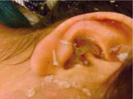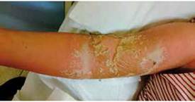 Paciente estuvo internada 9 días, en dicho tiempo las lesiones flictenares en fondo eritematoso se tornaron algunas con pústulas (30%) y la mayoría con debito seroso, y se descamaron en placas extensas comenzando del brazo derecho, piernas, brazo izq. abdomen, hasta el cuero cabelludo, y cara. (Figura 3,4).